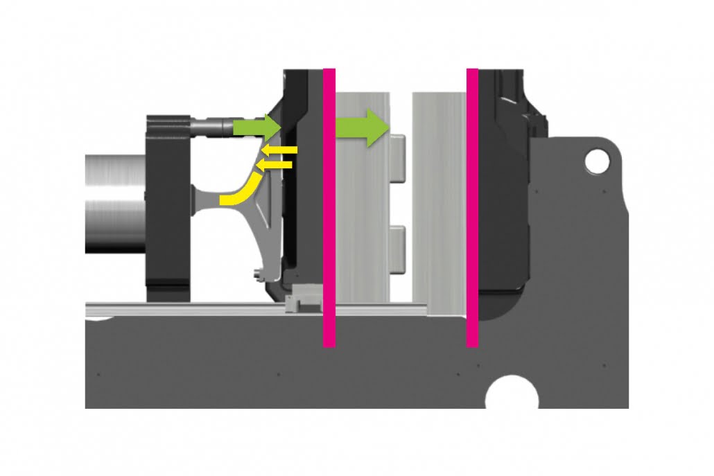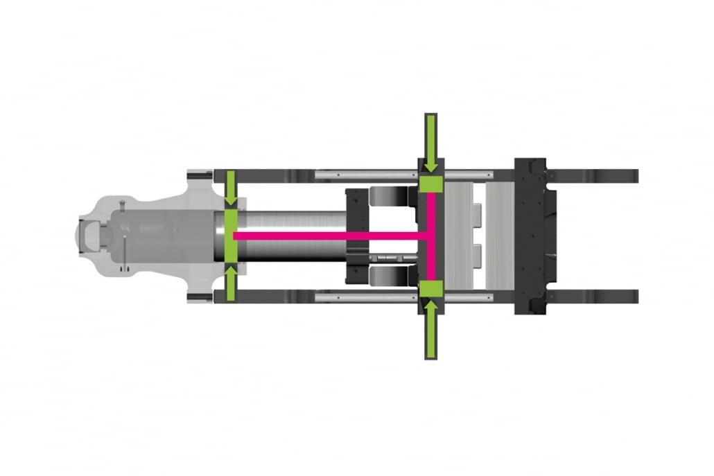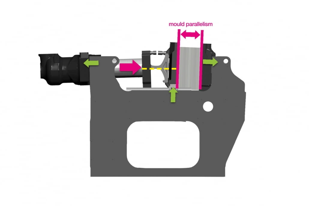 - Highest platen parallelism even in motion In contrast to other machine designs, the stationary mould mounting platen is not connected with the frame at the bottom end, but on the backside. This way it absorbs the machine’s vibrations in a symmetric manner and remains parallel to the moving platen even during acceleration and deacceleration.