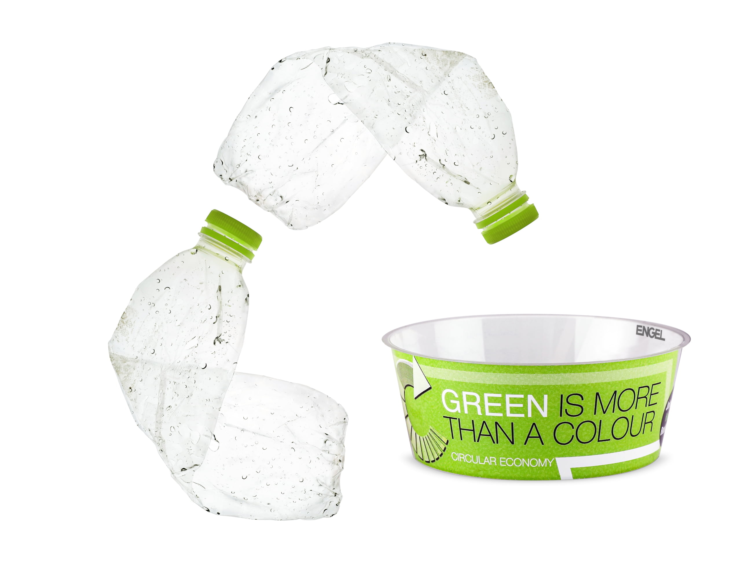 In addition to saving energy, the processing of recyclate is another important pillar of the sustainability strategy that ENGEL pursues for the benefit of its customers. An example is the application developed in collaboration with Alpla Group, Brink and IPB Printing. This allows post-consumer rPET containers to be produced in a single injection moulding process step, i.e. without the need to use preforms. Featuring a wall thickness of 0.32, the transparent, round 125-ml containers are representative of a whole genus of packaging, especially in the food industry. Thanks to integrated in-mould labelling (ILM), the containers are ready for filling as soon as they leave the production cell.