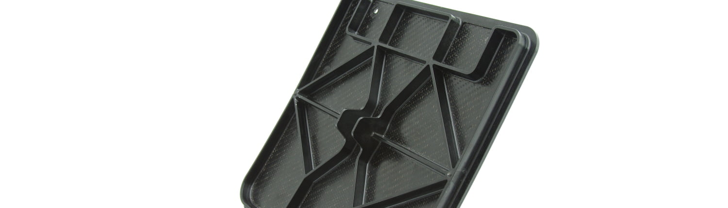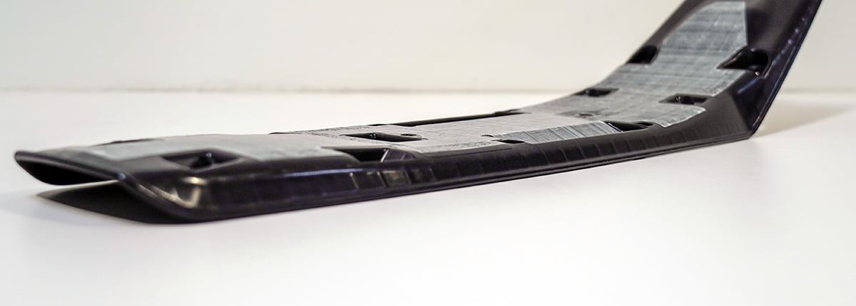 The thermoplastic sheets are heated in the IR oven, taken into the mould by the robot, formed in the mould and immediately overmoulded. The reinforcement ribs and a mounting clip are formed.