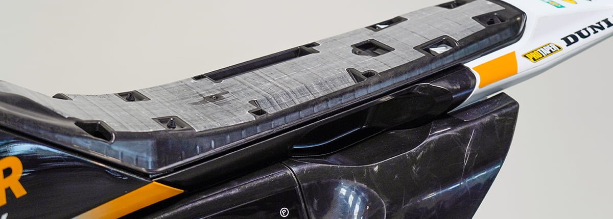 “In the tape sandwich process, we work with very thin, single-layer reinforcement materials such as tapes and fabrics with a polypropylene matrix, which are inserted into both cavity halves of the injection mould without preheating before the cavity is filled with polypropylene,” as Franz Füreder, Vice President Automotive & Mobility at ENGEL’s headquarters in Schwertberg, Austria, explains. “Due to the specific mechanical properties of the sandwich structure, we can already meet the stiffness required for motorcycle seat bases with a single-layer UD-tape. This means that the tape sandwich process requires significantly less energy and simpler production cell technology than conventional fibre-reinforced plastic composite processing methods. At the same time, the production costs drop.”